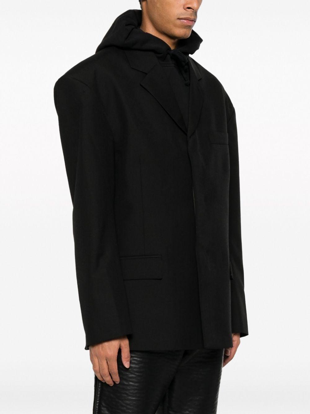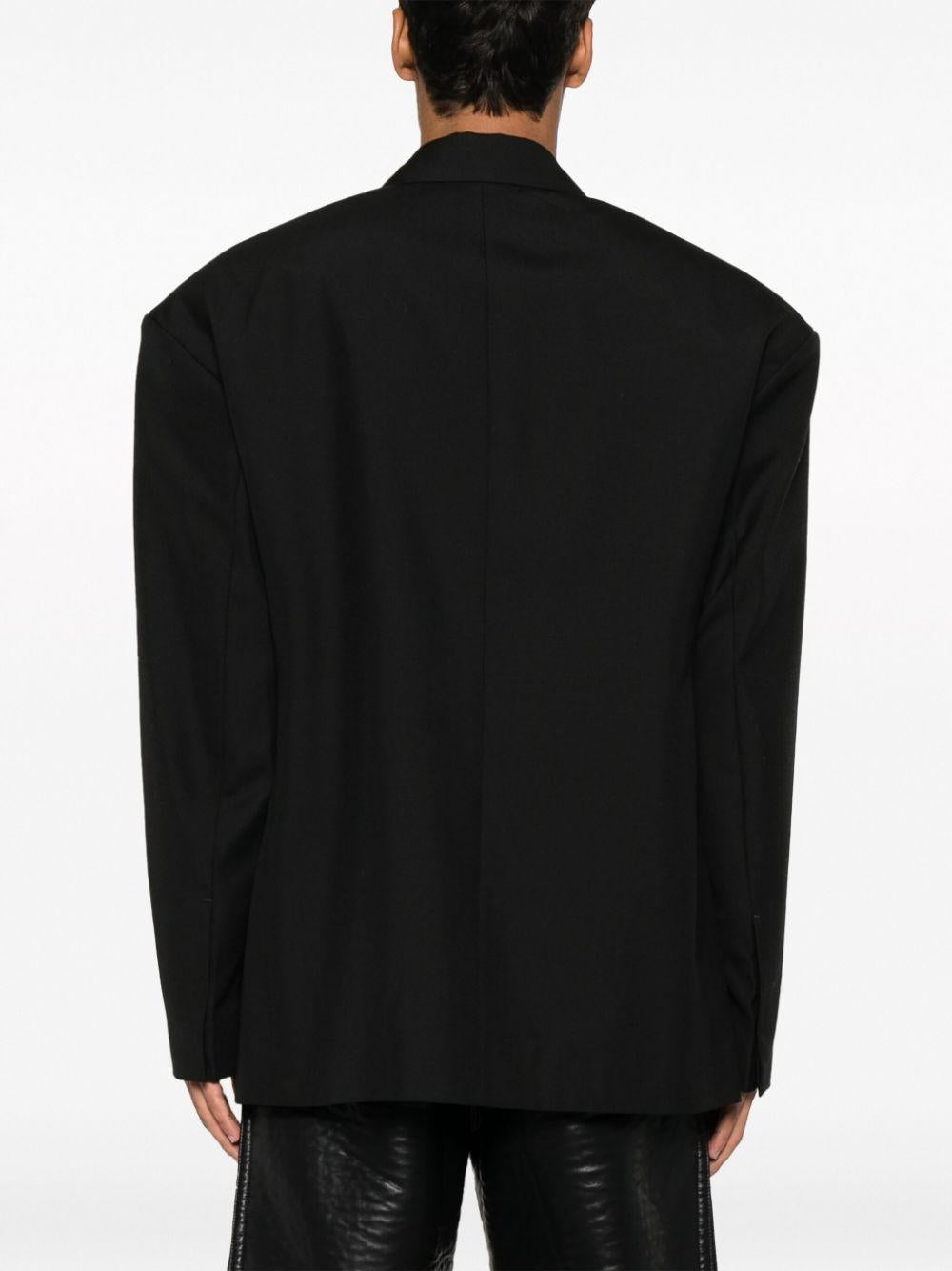 Blazer monopetto con spalline di 032c con cuciture tono su tono, spalline, risvolti classici, chiusura frontale con bottoni, maniche lunghe, tasca a filetto sul petto, due tasche frontali con patta, orlo dritto e nero intenso.