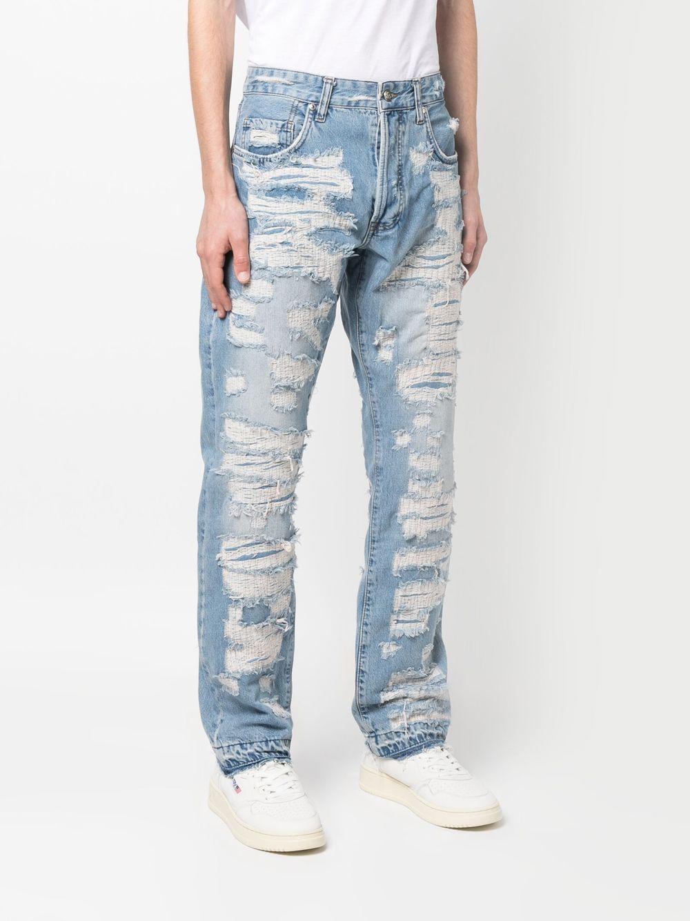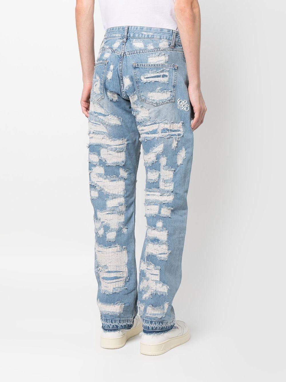 ripped straight-leg jeans from 02SETTANTACINQUE featuring light blue, cotton, washed denim, embroidered logo to the side, distressed effect, ripped detailing, straight leg, mid-rise, concealed fly and button fastening, classic five pockets and belt loops.